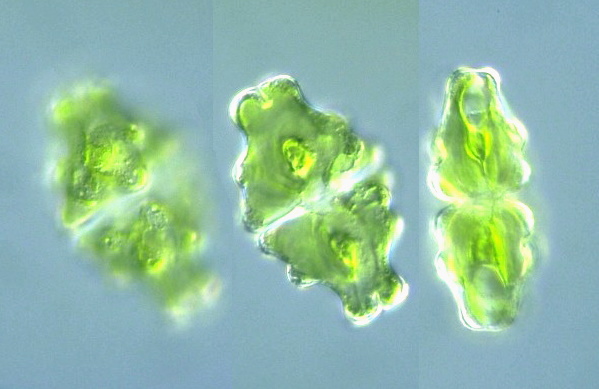 Species: Cell body 60-74 μm long, 34-46 μm wide, isthmus 8-15 μm wide, (Illustrations of the Fresh-water Algae, 1977).