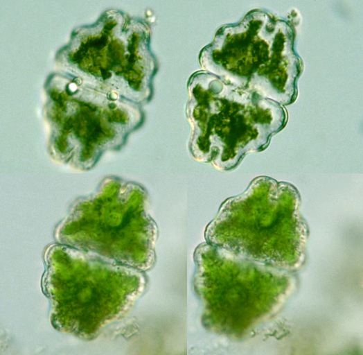 Species: Cell body 60-74 μm long, 34-46 μm wide, isthmus 8-15 μm wide, (Illustrations of the Fresh-water Algae, 1977).