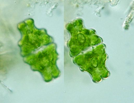Species: Cell body 60-74 μm long, 34-46 μm wide, isthmus 8-15 μm wide, (Illustrations of the Fresh-water Algae, 1977).