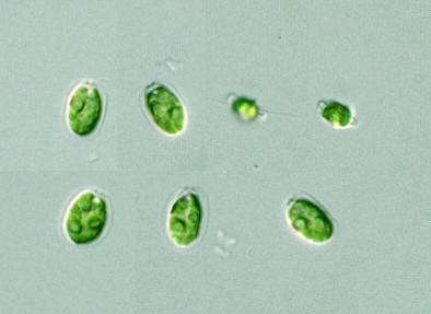 Pteromonas multipyrenoidea Lemmermann, daughter cells after cell division in mother cellwall, cell body μm long, μm wide, x 640, standing water under Akigase bridge, Akigase park, Saitama city, Saitama Pref., Japan, February 27, 2005 by Y. Tsukii