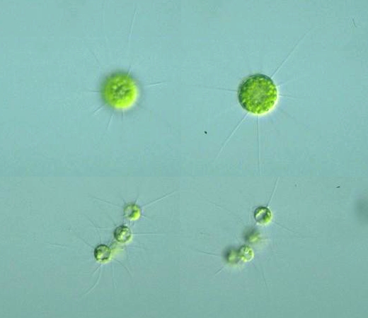 * Golenkinia radiata (Chodat) Wille: Vegetative cells spherical, 8-10 μm diam., with short spines 20-40 μm long, 1 chloroplast cup-shaped, 1 pyrenoid (Illustrations of The Japanese Fresh-water Algae, 1977).