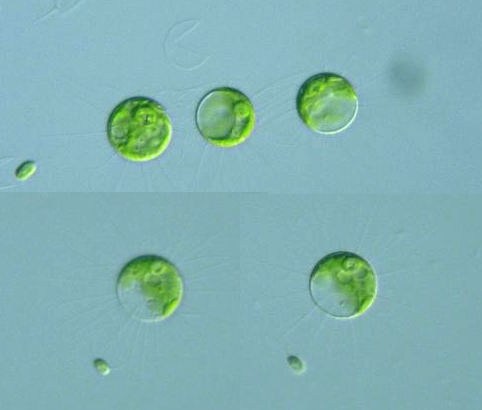 Golenkinia Genus: Unicellular, but autospore may become temporary colonical; planktonic; cell body spherical with many elongated spiny projections; a single chloroplast cup-shaped, with a single pyrenoid (Guide book to the "Photomicrographs of the Freshwater Algae", 1998).