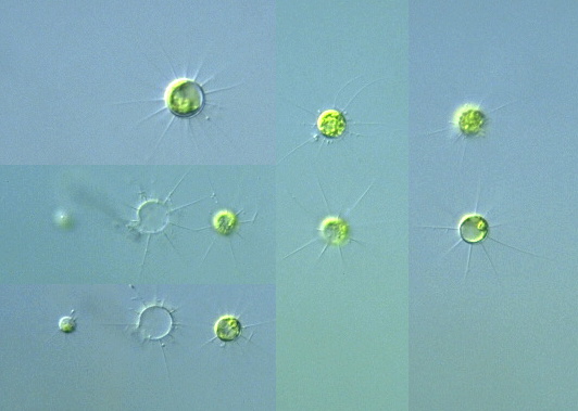 Golenkinia Genus: Unicellular, but autospore may become temporary colonical; planktonic; cell body spherical with many elongated spiny projections; a single chloroplast cup-shaped, with a single pyrenoid (Guide book to the "Photomicrographs of the Freshwater Algae", 1998).