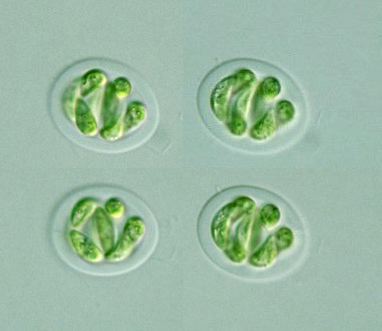 Nephrocytium Genus: Colony of 4, 8 or 16 cells, within a gelatinous sheath, which is spherical or ellipsoidal in shape; cell body broad crescent in shape, both ends rounded; a single chloroplast plate-like in shape, with a pyrenoid (Guide book to the "Photomicrographs of the Freshwater Algae", 1998).