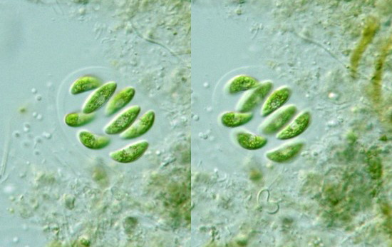 Nephrocytium Genus: Colony of 4, 8 or 16 cells, within a gelatinous sheath, which is spherical or ellipsoidal in shape; cell body broad crescent in shape, both ends rounded; a single chloroplast plate-like in shape, with a pyrenoid (Guide book to the "Photomicrographs of the Freshwater Algae", 1998).