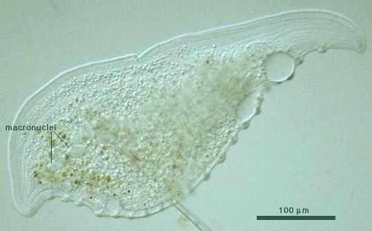 Species: Flask-shape to broad leaf-like; ventral seam with trichocysts, undulating; macronucleus moniliform (beaded); contractile vacuole terminal; 300-400 (up to 700) μm long (Kudo, 1966). 370 μm long; bluntly pointed at both ends; trichocyst warts on the dorsal surface; contractile vacuole posterior with a canal extending along the dorsal edge (Carey, 1992).