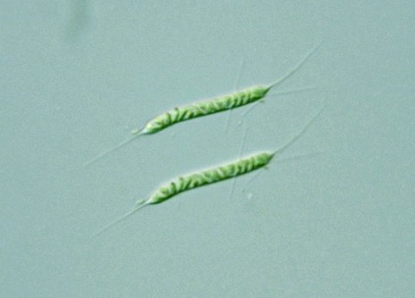 Centritractus Genus: Unicellular; planktonic; cell body elongated cylindroid, both ends with long spiny projections; cell wall separated into two parts overlapping at the mid-region;; several chloroplasts plate-like, without pyrenoids (Guide book to the "Photomicrographs of the Freshwater Algae", 1998).