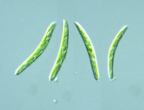 Characiopsis Genus: Unicellular, attached on a substrate at one end of the cell; cell body slightly curved, ovoidal or cylidrical in shape; 1 or two chloroplasts plate-like, without pyrenoids (Guide book to the "Photomicrographs of the Freshwater Algae", 1998).