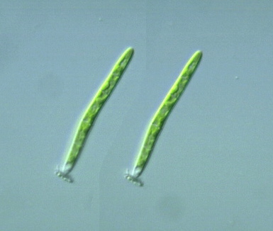 Characiopsis Genus: Unicellular, attached on a substrate at one end of the cell; cell body slightly curved, ovoidal or cylidrical in shape; 1 or two chloroplasts plate-like, without pyrenoids (Guide book to the "Photomicrographs of the Freshwater Algae", 1998).