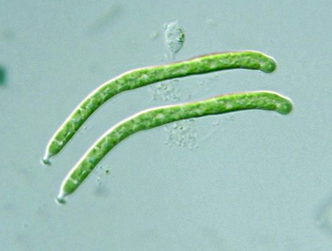 Ophiocytium arbuscula Genus: Unicellular; planktonic; cell body elongated cylindroid, curved or twisted; both ends rounded, with spiny projections; cell wall not separated into two parts (compare to Centritractus); several chloroplasts plate-like, without pyrenoids (Guide book to the "Photomicrographs of the Freshwater Algae", 1998).