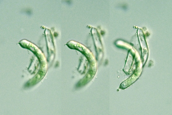 Ophiocytium bicuspidatum Genus: Unicellular; planktonic; cell body elongated cylindroid, curved or twisted; both ends rounded, with spiny projections; cell wall not separated into two parts (compare to Centritractus); several chloroplasts plate-like, without pyrenoids (Guide book to the "Photomicrographs of the Freshwater Algae", 1998).
