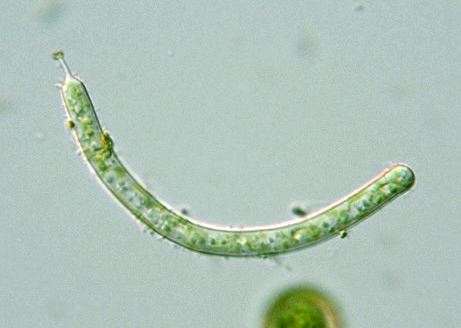 Ophiocytium gracillimum Genus: Unicellular; planktonic; cell body elongated cylindroid, curved or twisted; both ends rounded, with spiny projections; cell wall not separated into two parts (compare to Centritractus); several chloroplasts plate-like, without pyrenoids (Guide book to the "Photomicrographs of the Freshwater Algae", 1998).
