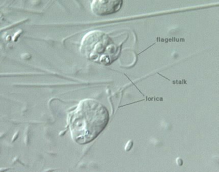 Order: Like choanoflagellates, but second trailing flagellum attaches to base of lorica; colars indistinct, rudimentary (How to know the protozoa, 1979).