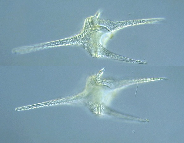 Genus: Body flattened; with one anterior and 1-4 posterior horn-like processes; chloroplasts
