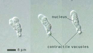 pseudopods hemispherical, clear & eruptive, nucleus 2-3 μm diam.,