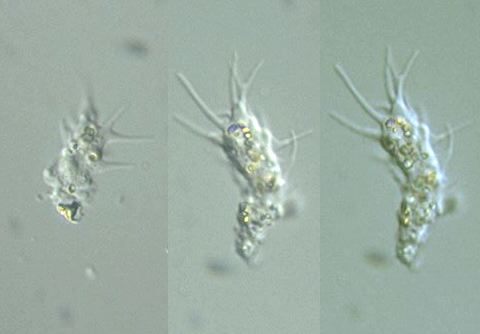 V. bacillipedes: body 8-25 μm long, cell shape triangular; hyaline anterior zone 1/4 to 1/3 of body length; 0-6 or more long (5-15 μm long) tapered pseudopodia that wave only when being retracted; cytoplasm with several granules; fresh water (How to know the protozoa, 1979).
