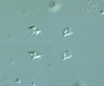 V. bacillipedes: body 8-25 μm long, cell shape triangular; hyaline anterior zone 1/4 to 1/3 of body length; 0-6 or more long (5-15 μm long) tapered pseudopodia that wave only when being retracted; cytoplasm with several granules; fresh water (How to know the protozoa, 1979).