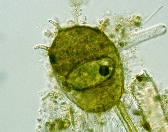 Centropyxis sp. (C. aculeata ?), test 140 μm long, 100 μm wide, L/W=1.4, pseudostome 35 μm long, 77 μm wide, spiny projections 25 μm long, x 400, x 640, a small pond at Obihiro University of Agriculture and Veterinary Medicine, Obihiro city, Hokkaido, Japan, October 13, 2005 by Y. Tsukii