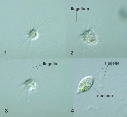 Heliozoa stage with flagella, cell body spherical, 14 μm in diam.