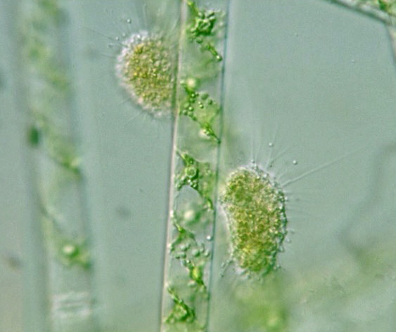 Vampyrella lateritia Genus: Algophorous parasites; cytoplasm reddish; pseudopodia tapering, flexible (Illustrated Guide, 1985). Heliozoa-like; endoplasm vacuolated or granulated, with carotin granules; numerous vesicular nuclei and contractile vacuoles; multinucleate cysts, sometimes with stalk; 50-700 μm in diameter (Kudo, 1966).