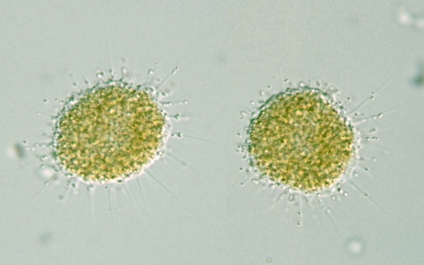Vampyrella Genus: Algophorous parasites; cytoplasm reddish; pseudopodia tapering, flexible (Illustrated Guide, 1985). Heliozoa-like; endoplasm vacuolated or granulated, with carotin granules; numerous vesicular nuclei and contractile vacuoles; multinucleate cysts, sometimes with stalk; 50-700 μm in diameter (Kudo, 1966).