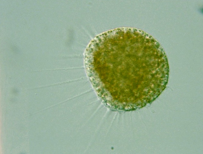 Vampyrella Genus: Algophorous parasites; cytoplasm reddish; pseudopodia tapering, flexible (Illustrated Guide, 1985). Heliozoa-like; endoplasm vacuolated or granulated, with carotin granules; numerous vesicular nuclei and contractile vacuoles; multinucleate cysts, sometimes with stalk; 50-700 μm in diameter (Kudo, 1966).