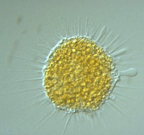 Vampyrella lateritia, with long pseudopodia (like axopodia), cell body rounded up to 71 μm diam., filopods up to 44 μm long, x 400, x 640, Japan, 1998 by Y. Tsukii