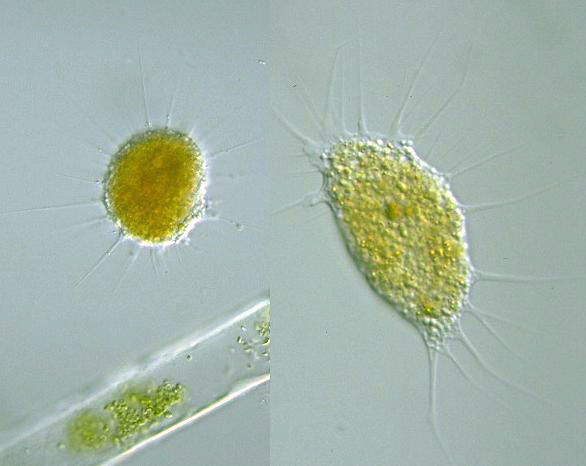 Vampyrella lateritia, elliptical cell body 35 μm long, 65 μm wide, spherical cell 30 μm in diam., x 640, Iruma Park, Saitama Pref., Japan, February 2002 by Y. Tsukii