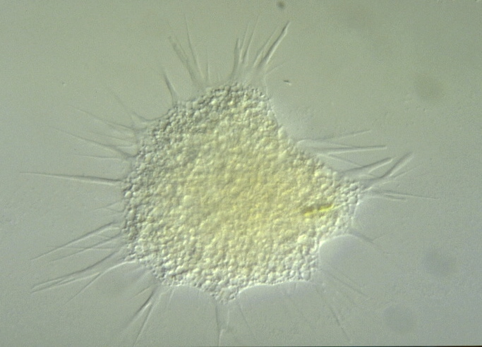 Vampyrella Genus: Algophorous parasites; cytoplasm reddish; pseudopodia tapering, flexible (Illustrated Guide, 1985). Heliozoa-like; endoplasm vacuolated or granulated, with carotin granules; numerous vesicular nuclei and contractile vacuoles; multinucleate cysts, sometimes with stalk; 50-700 μm in diameter (Kudo, 1966).