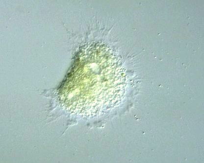 Vampyrella Genus: Algophorous parasites; cytoplasm reddish; pseudopodia tapering, flexible (Illustrated Guide, 1985). Heliozoa-like; endoplasm vacuolated or granulated, with carotin granules; numerous vesicular nuclei and contractile vacuoles; multinucleate cysts, sometimes with stalk; 50-700 μm in diameter (Kudo, 1966).